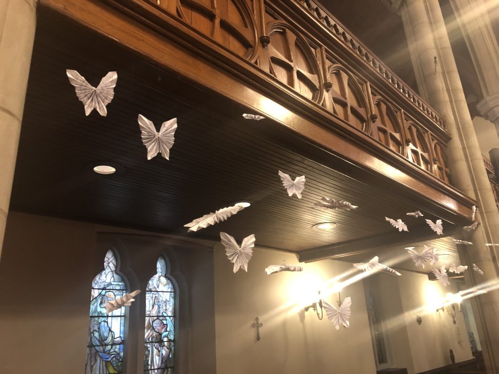 See 239 origami butterflies hanging in the light shining through stained glass windows. Like a snowflake, each butterfly is unique. It is folded by hand from a Sunday service leaflet printed with special prayer lists and praises. Listen to music that fills the air space. Like Tibetan prayer flags fluttering in the Himalayan air, the mass of butterflies release their prayers and praises to be carried by the music to the upper beams of the Gothic space.